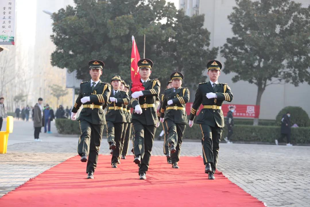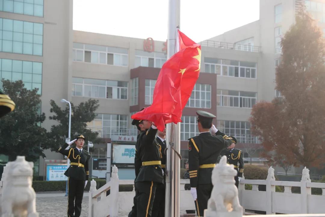 上午九时,学院国旗护卫队的同学护卫着国旗走向升旗台。在激昂的《义勇军进行曲》中,鲜艳的五星红旗徐徐展开,在全体师生的注目中,迎着初升的朝阳,在晨曦中迎风飘扬。